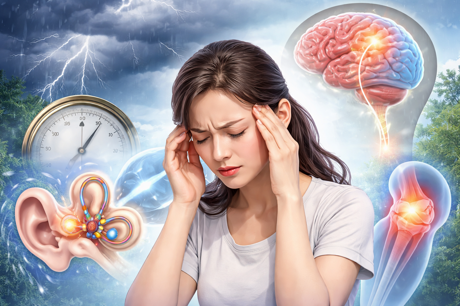 天気が崩れる前に起こる頭痛や関節痛は、気のせいではありません。 気圧変化を感知する内耳、自律神経の乱れ、血流や筋緊張の変化が複雑に関係しています。